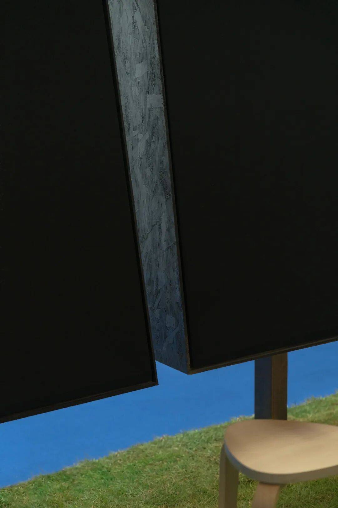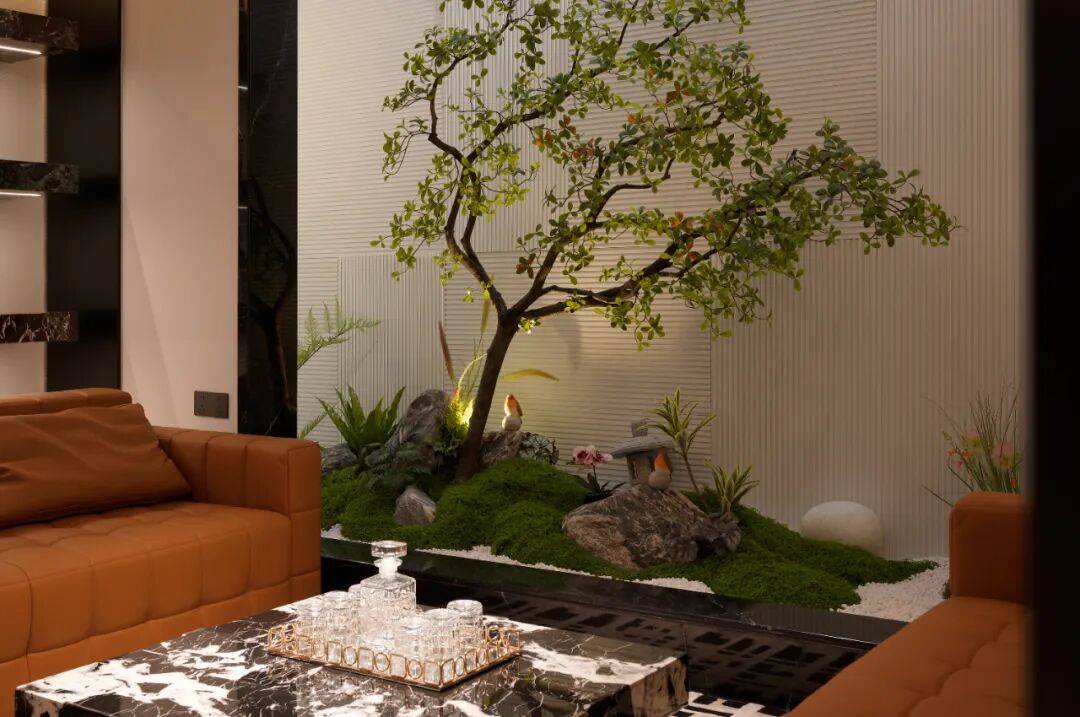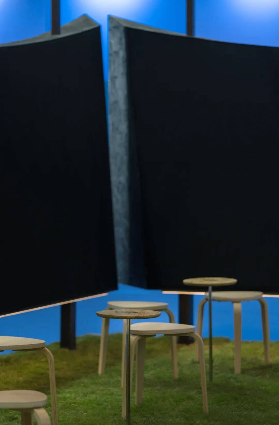 03. 一个被设计用于"停留"的品牌空间 「CHU触」展厅占地约12米x7米,它弱化传统展位的参观路径,着力打造停留型空间。地面铺以草地,低矮木凳环绕中央水池,桌面高度经过反复推敲,引导使用者放松身心。空间中心是可供围坐共享的空场,这种布局让使用者从快速浏览转为停留,观察与交流,延长体验生命周期,让品牌从被动展示转向主动建立情感联结。