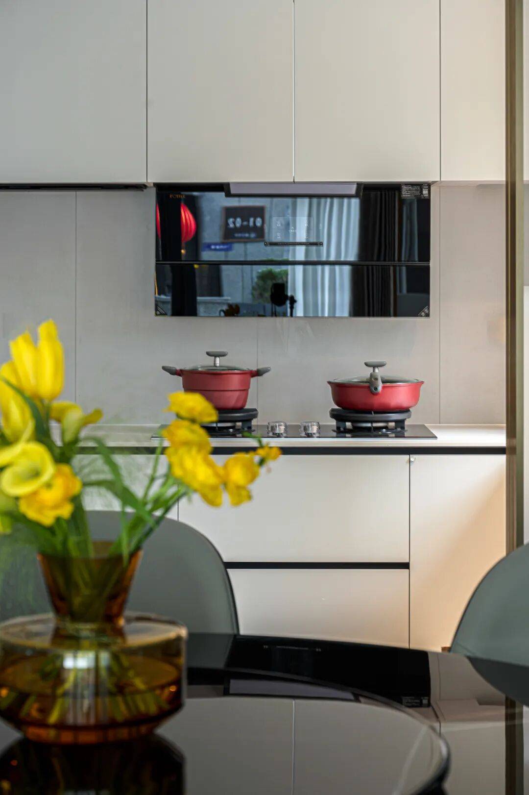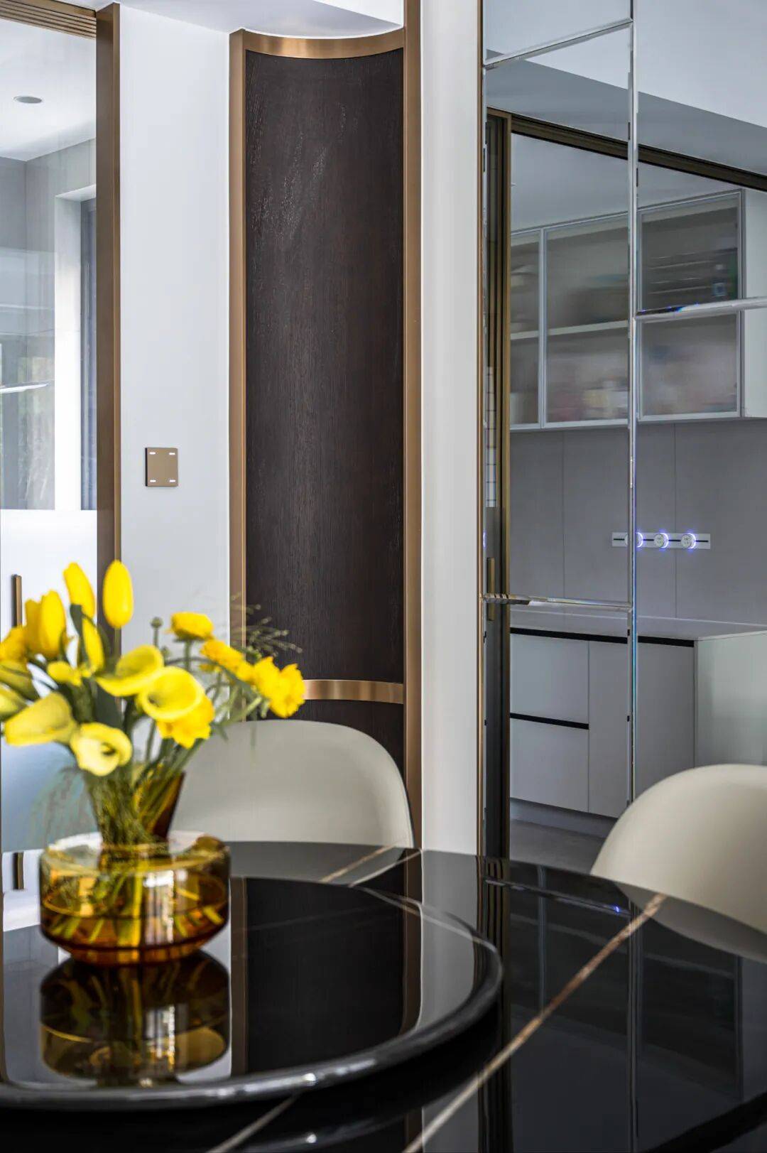 情景化社交餐厅在镜面材质的辉映下留痕,浸润烟火人间的日常里。岩板台面、木饰面、玻璃灯体与镜面反射,不同材质建构了空间的品质感。