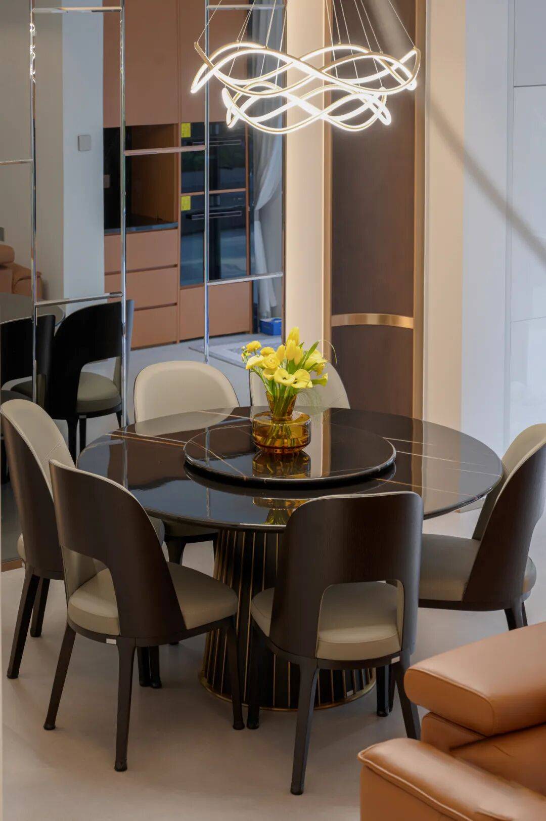 客餐厅区域 客餐厅区域,其艺术氛围顺着精致的楼梯流淌,抵达那位于楼梯近旁的客厅。大理石如水墨浸润在墙壁石材之上,赋予空间温暖气息与雅奢基调。