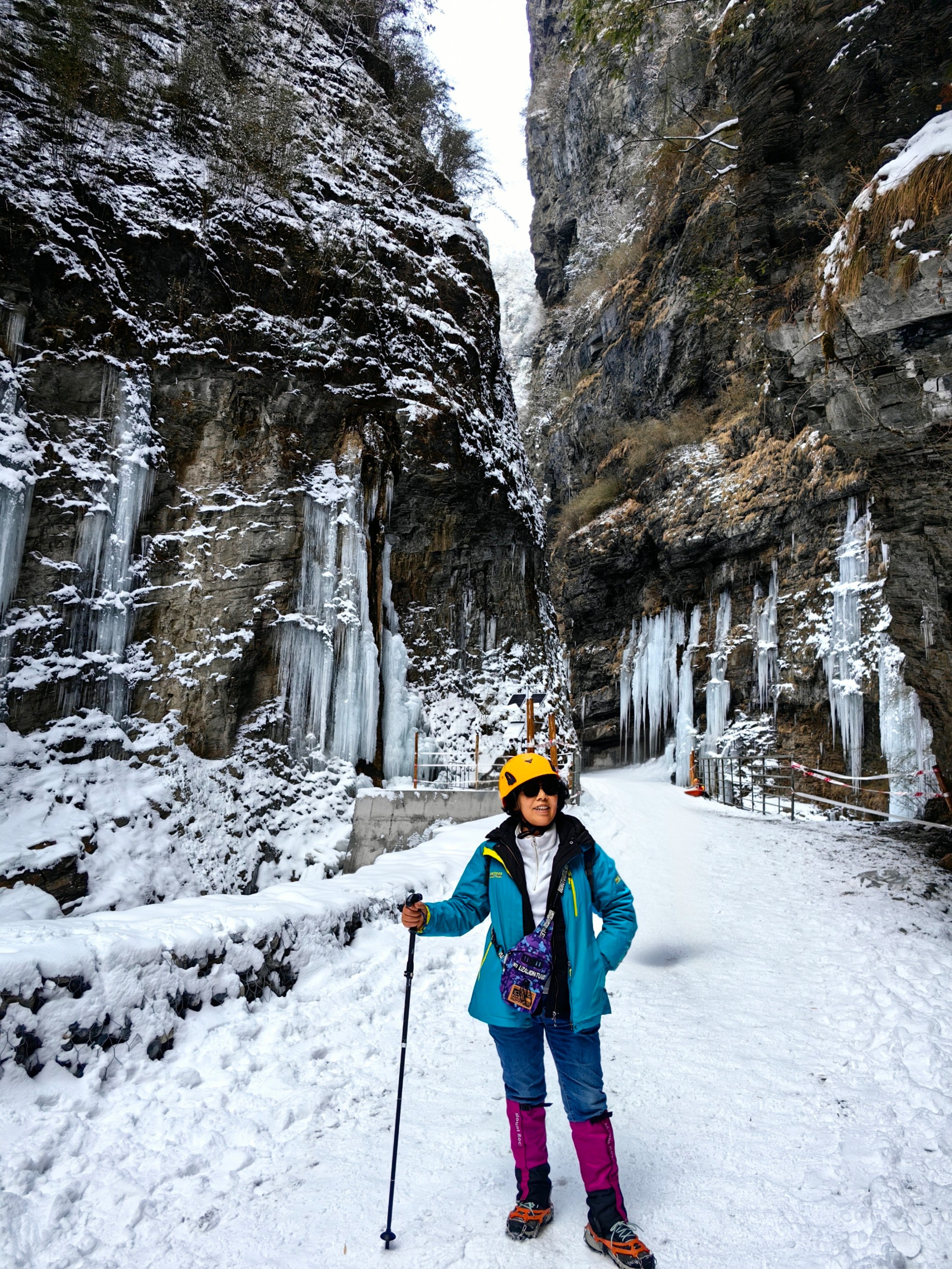 你见过冰瀑吗?你去过平武虎牙吗?那里有出了名的冰瀑奇观呢! 终于等到九绵(九寨沟→绵阳)高速通车了,一直心心念念的虎牙大峡谷冰瀑,我终于冒着严寒,大着胆子去看了。时间是1月31日~2月日1日)(因写“北海行”游记耽误,没及时写,现在补作业)。 虎牙冰瀑,位于四川绵阳平武县虎牙藏族乡雪宝顶国家级自然保护区境内的虎牙大峡谷。 虎牙大峡谷,距绵阳市230公里,距九寨沟220公里。与“人间瑶池”黄龙寺腹背相依,距黄龙寺70公里。位于岷山山脉主峰雪宝顶(海拔5588米)东南侧,距九环线辅线(平松公路)仅9.8公里。 虎牙大峡谷,因地形险峻、峡谷两侧如虎张牙而得名,区域内拥有丰富的冰川地貌和冬季冰瀑奇观。 峡谷长30公里,平均深500米,宽10—30余米不等。峡谷中有条虎牙河(属涪江一级支流),一年四季都在咆哮、奔腾,哪怕是冰天雪地,悬崖挂满冰瀑,它也不会结冰。 我们头天住水晶镇,第二天一早出发去虎牙大峡谷。 我们在景区大门下车,然后步行去右面的峡谷(即虎牙大峡谷)。领队说没多远,大约半个多小时就到了。 一下车,就明显感觉气温很低,天气很冷。到处都是冰天雪地,连卫生间都冻住了,没法冲水。 地面看起来是雪,实际早已变成硬硬的冰渣路了。一迈步,脚下硬滑难走,我们赶紧穿上冰抓鞋,走起来“咔嚓咔嚓”的。 此时,我的脚冷得生疼难忍,只得和队友们加快步伐拼命往前赶路,以期增加热量。结果是走到一线天前面的黑龙涧大冰瀑,才暖和起来,甚至有点热需要敞开冲锋衣羽绒服了。 一路上,地面的冰雪很厚,但峡谷两边的山上、树上,积雪却很少甚至没有。峡谷里的小山溪完全没有结冰,溪水在山石沟中哗哗流淌,看上去绿莹莹白花花,翡翠般质地,很诱人! 一路上,我们看到了雾锁金山、日照金山的奇观(似乎一路看到几次)。经过悬空栈道,如挂在悬崖峭壁上,非常险峻。镂空铁栈道既便于漏雪,同时又可以观山脚下的小山溪。 过桥继续前行,很快就来到一线天,两侧岩壁紧贴,高耸入云。这里就能看到比较大面积的冰挂了。虽然,一路都可见少量冰挂(小冰挂),但这里的大冰挂还是更大,更成片,我们赶紧停下来打卡拍照,站远一点,还真能和高崖上的冰挂同框合影呢。 再往前,便是黑龙涧冰瀑了,这里的冰瀑算是这次看到的最壮观的景象了。 这里,冰体宽广,滑亮逼人,你如同来到了一个静态的冰雕世界,极具视觉冲击力! 峡谷左边,蓝冰巨幕,冰晶玉洁、通透亮丽,冰柱、冰挂、蓝冰交织成童话冰雕世界。 峡谷右边,大朵大朵的冰花,宛如天人雕琢的松花,向下悬垂出一把把利剑,剑锋尖利无比,晶莹透彻中带着一抹水晶般美丽的蓝色,分外迷人! 这就是天赐的虎牙冰瀑奇观!国内罕见、世界一流! 而且,虎牙大峡谷远不止我们见到的这些冰瀑,它是群落式冰瀑群。有流水的悬崖,就会有冰瀑!冰瀑群保持了最原始、最纯粹的自然状态,实在难得!只要你敢于探索,沿途都可近距离接触冰瀑,随时能拍出氛围感大片!而且,人少景美,值得一去! 虽然我们看不够拍不够,但还是不得不依依不舍地离开,原路返回,乘观光车前往龙口大瀑布。 去龙口大瀑布来去大约有6公里,进去基本是上行,高度一直在提升,虽不知上升了多少千米,但我却觉得非常累,从入口到瀑布大约要徒步上行1个多小时。虽然现在已经修了木栈道,但绝大多数为厚厚的冰雪路面,有坡度,很滑,没有冰爪鞋和登山杖,爬起来会更加困难。 在这个峡谷里,冰挂冰雕比较少见,沿途多为雪景,越往上,冰雪越是壮观。路上、树上、山上积雪都很厚,但令人惊奇的是,有一条自上而下的小山溪,始终在石头沟谷里欢快奔流,充满生命的活力。而且这条山谷未过度开发,还保留着原生态的峡谷风光。树上堆着雪粒,挂着冰花,山上因气温升高,向阳的山坡雪就少些,树枝上的雪也融化了不少。这都是自然使然,我们要懂得欣赏。 我们在冰天雪地里行走,一点不觉得寒冷,反而很热。虽然雪景不比往年壮观,但我们仍然觉得十分稀奇,一路边走边拍,还在路途吃了简餐,补充能量。 终于,我们来到了龙口瀑布观景平台。 抬眼望,大龙口瀑布高25米、宽约50米,从半山腰的岩洞中奔涌而出,主瀑如四条小白龙凌空飞降,还有很多支瀑如珠帘垂落呼应,水珠飞溅,水雾弥漫,如有仙气。 离得稍远一点的小支瀑,也许因为弱小,力量不够,便凝结成小小的冰挂,自成一景。 这里,由于海拔高,雪景更加壮观,地面、树上都堆积很厚,有种人迹罕至,鸟兽遁形,无法抵挡的寒气。我们刚刚停下来拍了几张照,没怎么走动,一下子就倍感寒冷了。 不过,除了瀑布不结冰,还有一种奇观,那就是瀑布上满是绿意浓郁的苔藓,它们居然不为低温酷寒屈服,顽强地展示自己生命的能量,我们人类真的自愧不如啊! 这里的瀑布说不上壮观,却与周围冰封雪盖,玉树琼花的景象形成极为鲜明的反差,实属难得! 看完龙口瀑布,本可以继续前行,但陪同的工作人员说,上面禁止通行了,未开放,不安全。于是我们便原路返回。 游虎牙大峡谷,有种探险的刺激,也是勇敢者的挑战!作为川西北绵阳的地质奇观,是我们四川人、绵阳人的福气! 工作人员和领队都说,今年的虎牙大峡谷冰瀑,由于暖冬天气,气温不够低,跟往年相比,壮观程度差多了,更远更壮观的地方也没去,但我仍然觉得很霸气,毕竟,我以前没来过,也没见过! 而且,这是自2018年底起,因筹建项目暂停对外开放之后,今年是重新打造后首次开放