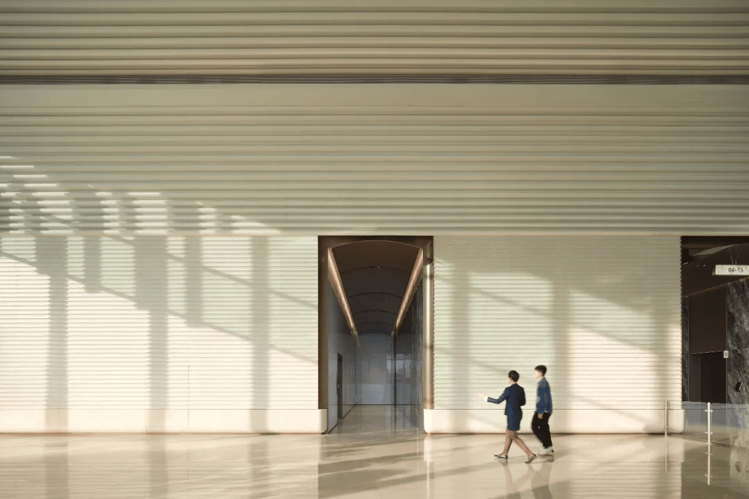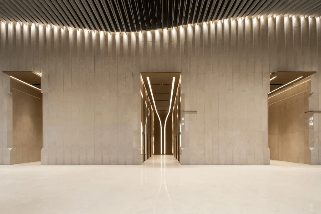 摄影版权:王可WONGKE 项目完整介绍可点击下方青年建筑文章链接: 08. 广州白云(棠溪)站东地块双塔室内设计项目 都设设计 项目位于广州白云(棠溪)站东地块双塔之上,由广州地铁院统筹、都设担纲室内设计,延续“水润木棉”与“高山流水”的建筑哲思,将立面流线转译为可感的室内体验。东北塔以“木棉成序”为主题,弧形吊顶与石材墙面一体化延展,引导视线对景白云山,层叠光影模拟水流倾泻,营造沉稳有序的公共场所形象;东南塔以“潮涌珠江”为意象,连续起伏的金属吊顶与褶皱石材墙面形成动感节奏,机电系统隐于构造之中,实现纯粹视觉与完整功能的融合。地面层与标准层在材料与做法上有序简化,保持系统一致性,使枢纽上盖办公从交通附属转向兼具自然意境与城市活力的公共空间。