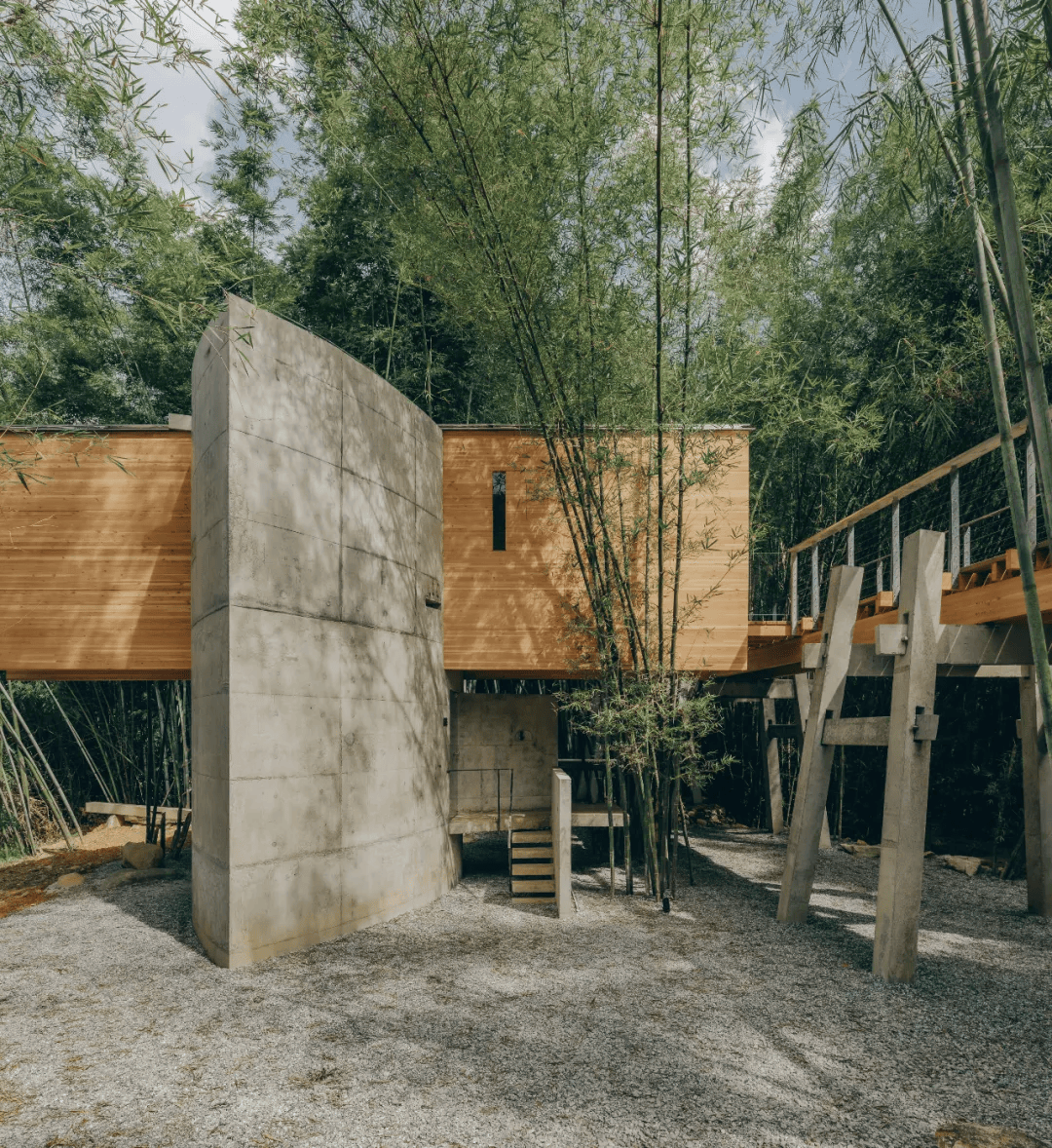 古桥微馆位于惠州麻榨镇十三坝桥旁竹林中,是“环两山建筑艺术计划”中的一处在地策展实践。项目以田野调研为起点,梳理坝桥与“板凳桥”两类民间石桥构造,将其转译为空间语言:一组梭形混凝土体与木构通道嵌合,抽象“鹅胸”坝桥的榫卡关系,容纳展厅、水吧与卫生间;一条依据板凳桥逻辑生成的高架栈道,以细长柱梁形成“一”字形观看路径,强化对十三坝桥的眺望体验。立面窗洞取自围屋葫芦形等在地元素,施工模具与余梁转化为景观构件,在保留竹林的前提下嵌入场地。建筑作为“古桥微馆”,通过艺术展陈与轻业态介入,为逐渐被忽视的乡土桥梁建立记录与再认知的公共平台。