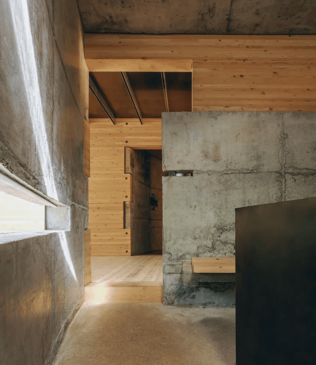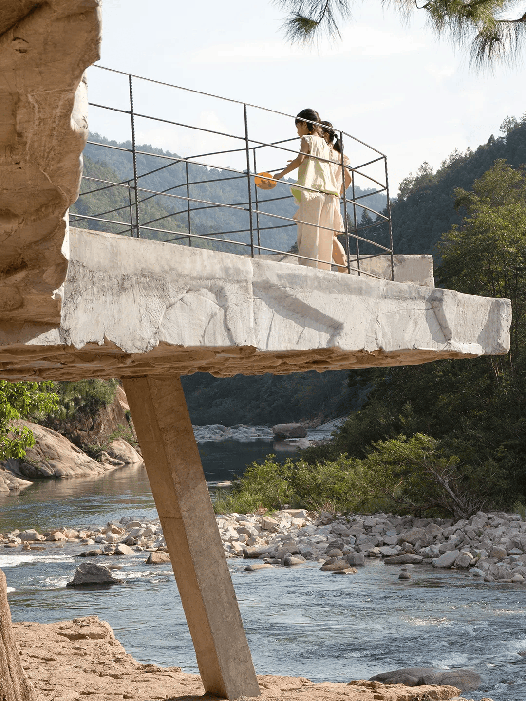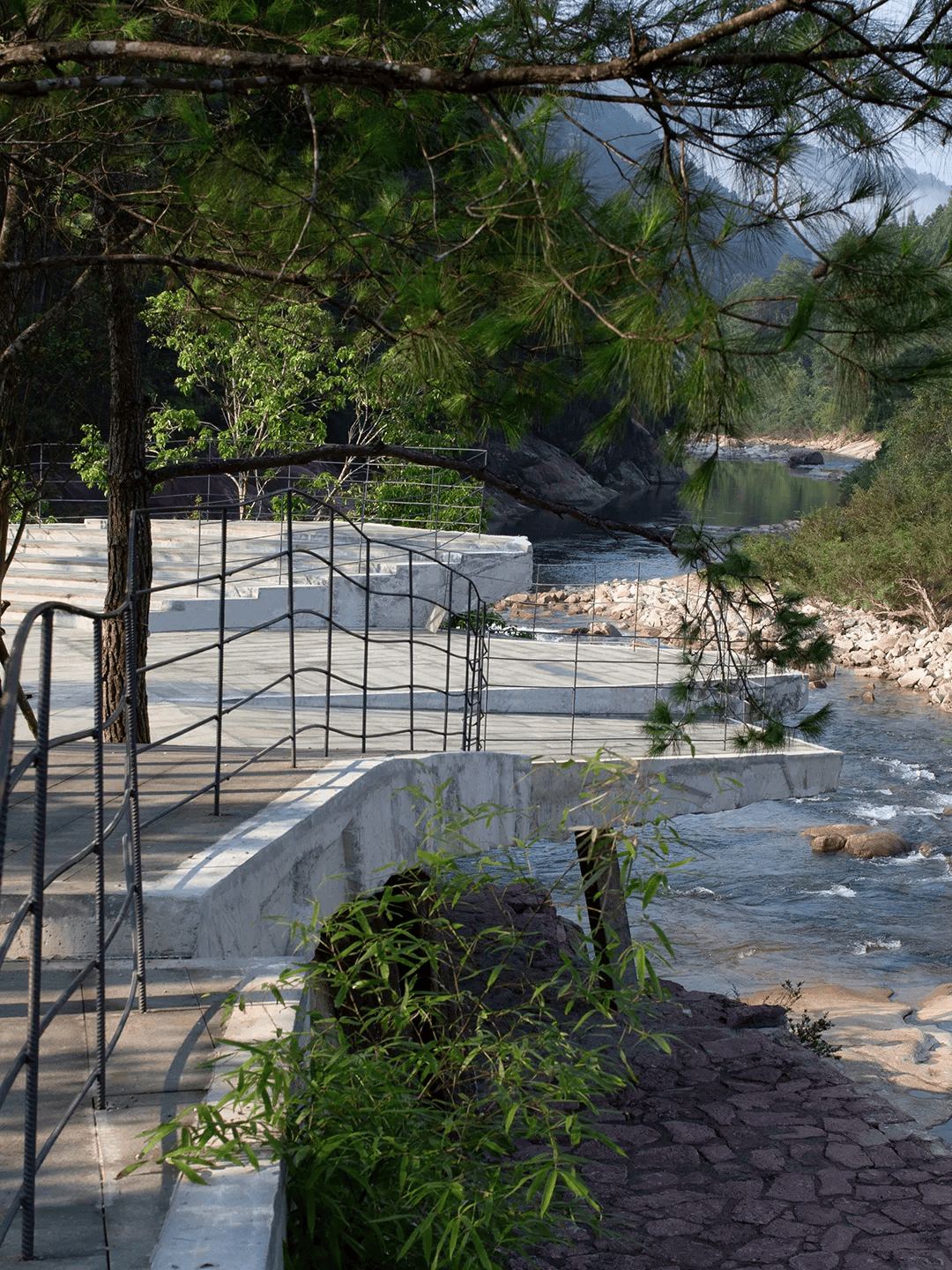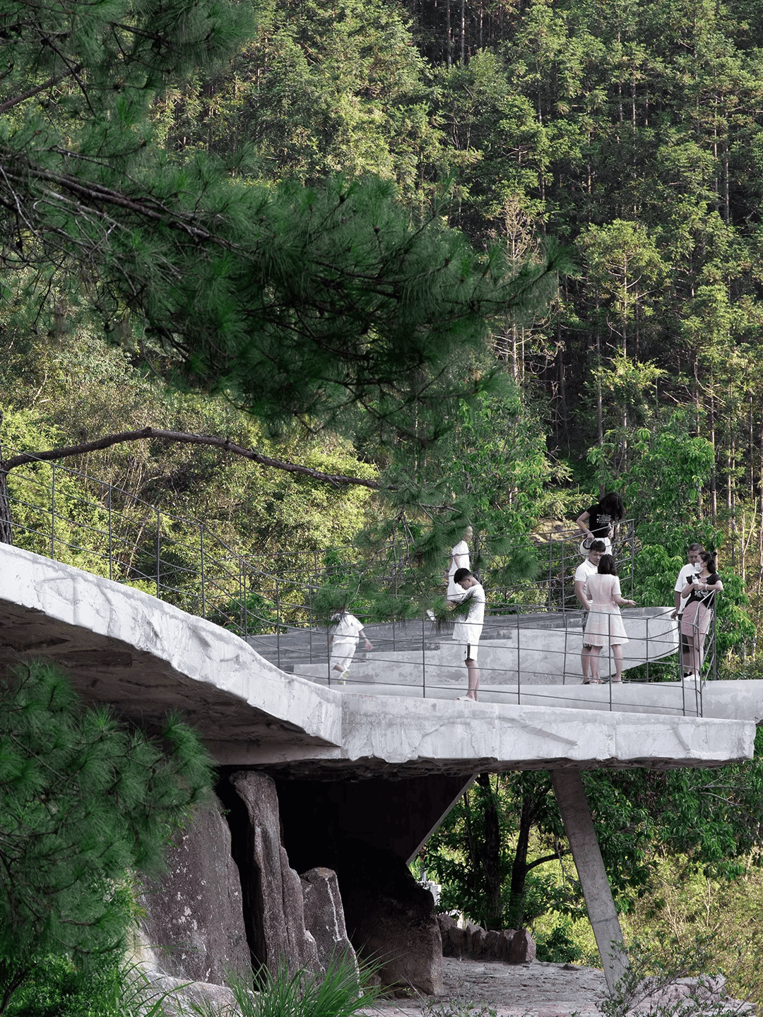 月亮湾瀑布观景台位于武夷山国家公园入口,选址于瀑布前方被岩石分割的台地之上。建筑围绕场地内16棵原生树展开,以四个相互插入、微微倾斜的多边形体量构成,如河床巨石般向瀑布挑出,并为村民保留看台与活动空间。设计以“为自然画下划线”为理念,通过石片模板拓印混凝土肌理,使结构表面呈现如原石般的自然纹理,模糊人工与自然边界。结构上以框架体系为基础,显露一根斜向混凝土单柱形成视觉张力,在克制的技术表达中回应自然力量与人造介入之间的关系。