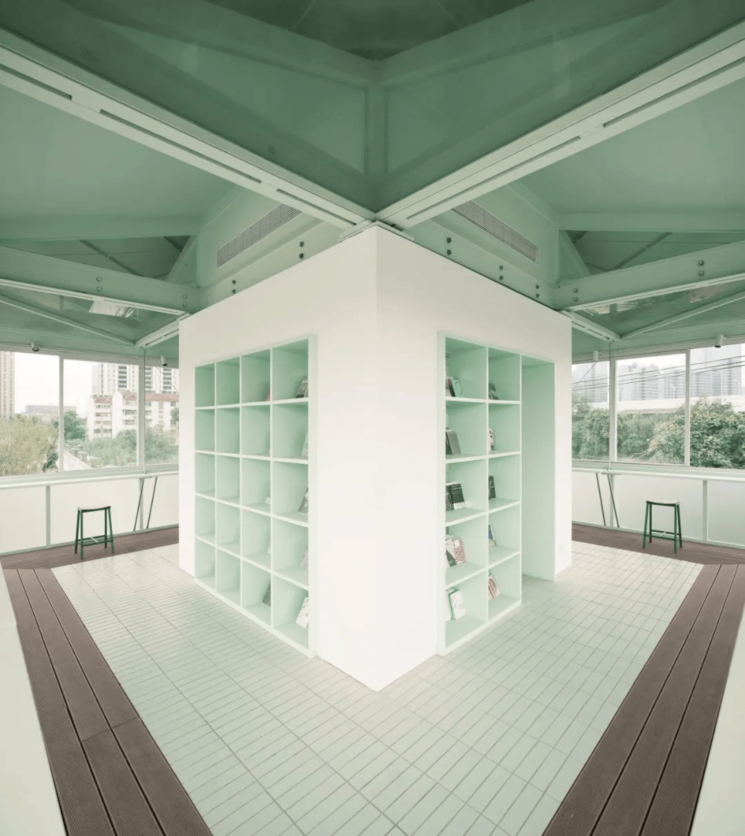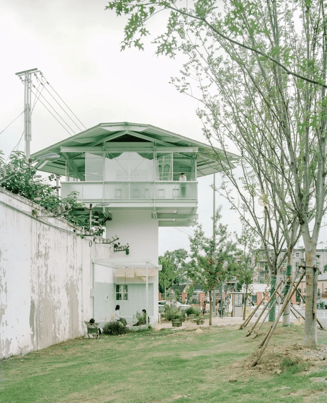 这座24小时小书店由合肥合柴1972园区内一座废弃监狱看守塔改造而成。原建筑仅7㎡底层面积、二层为巡逻平台,保留机枪孔等痕迹。经结构检测与加固后,采用钢结构“吊挂”体系,在屋面梁上架设C型槽钢与吊杆,悬挂新增楼板与阅读平台,在不增加基础荷载的前提下拓展使用空间,并外挂阳台串联室内外。屋面旋转切角形成四叶草形体,回应高压线限制。室内将矮墙改为书架,结构构件转化为书桌与吧台支撑。项目以最小干预重塑场所精神,使冰冷塔楼成为向社区敞开的温暖阅读空间。