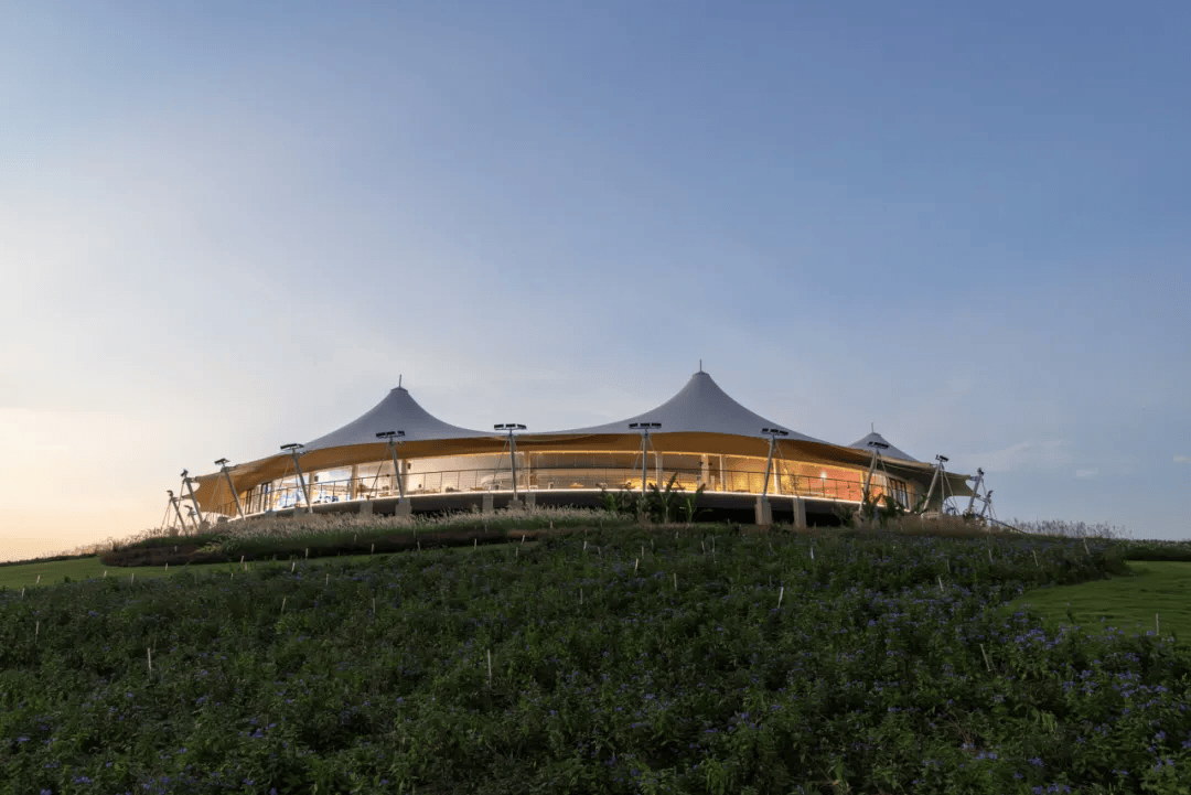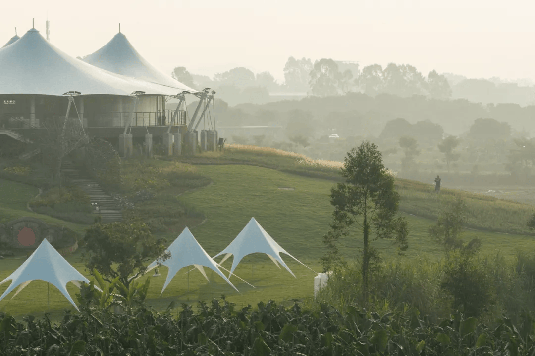 项目位于罗浮山南麓,依托古村与田园山水资源,打造集乡村活化、生态修复与微度假体验于一体的岭南乡村样板。总体规划遵循“轻介入、可逆化、生态化”原则,串联入口服务、核心体验与生态渗透空间,植入帐篷餐厅、活动草坪、湖区垂钓与自然互动乐园等板块。星空帐篷以轻型张拉膜结构顺应地形布置,结合花海与夜景灯光,形成昼夜皆宜的消费场景;草坪与模块化设施支持市集与节庆活动;湖区平台架空延展,降低生态扰动;儿童区以自然材料营造互动空间。项目通过地景建筑与运营导向融合,构建“罗浮山下,自在生活”的乡村更新范式。