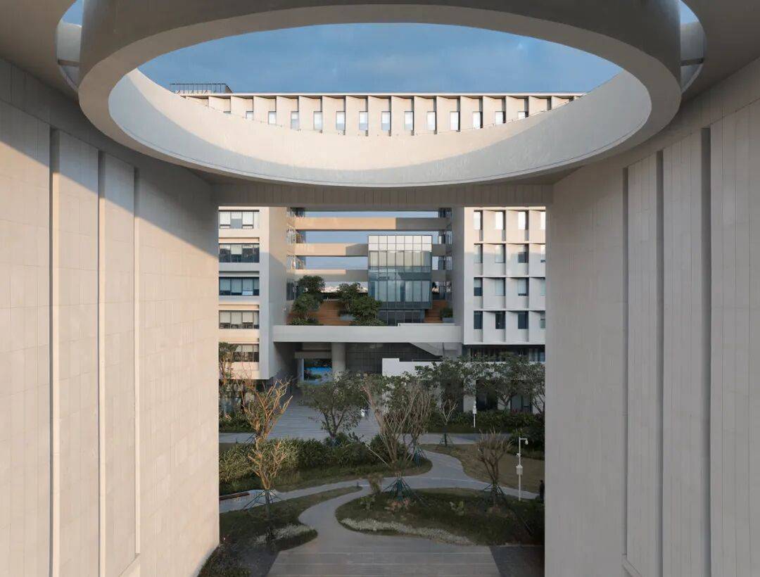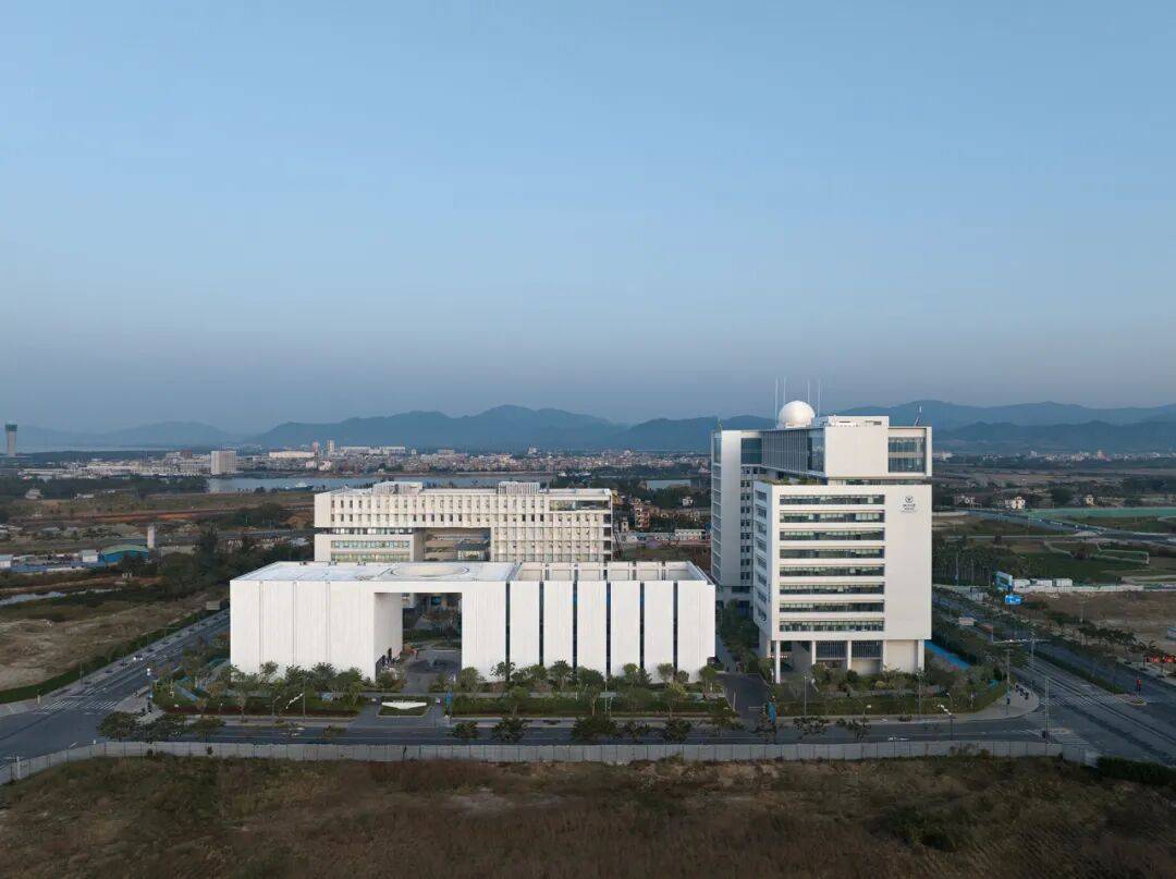 空间组织以“观澜”形成叙事结构,辅楼高大的架空门厅,与主楼室外景观台阶及圆桌会议厅形成轴线对位关系,通过框景和对景的手法形成空间序列;综合研发楼通过形体扭转获得的架空空间,既是观澜院落的背景,又作为组团内富有活力的非正式交流空间,高层顶部设两座海洋观测大厅,实现“近可观院、远可望海”的视野与功能需求。
