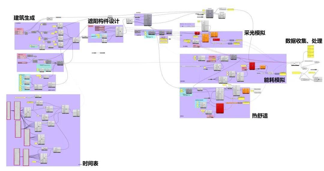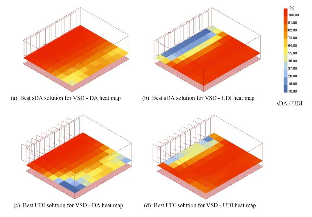 竖向遮阳百叶系统的宽度、角度与间距是影响室内光热环境与能耗性能的关键设计变量。遮阳百叶在阻挡夏季太阳辐射、节约空调能耗、提升室内热舒适性的同时,也可能显著削弱自然采光水平,导致人工照明能耗增加,形成光热性能间的矛盾。设计结合三亚当地气候条件,采用遗传算法对不同朝向的竖向百叶进行参数化模拟与多目标优化,得出兼顾遮阳效率与采光需求的竖向百叶最优几何参数组合,并结合建筑造型与景观朝向完成形态整合。这一基于性能模拟的理性设计方法,不仅与科研建筑注重实证与优化的内在精神相契合,亦为湿热地区建筑外遮阳系统的精细化设计提供了可量化的技术路径。