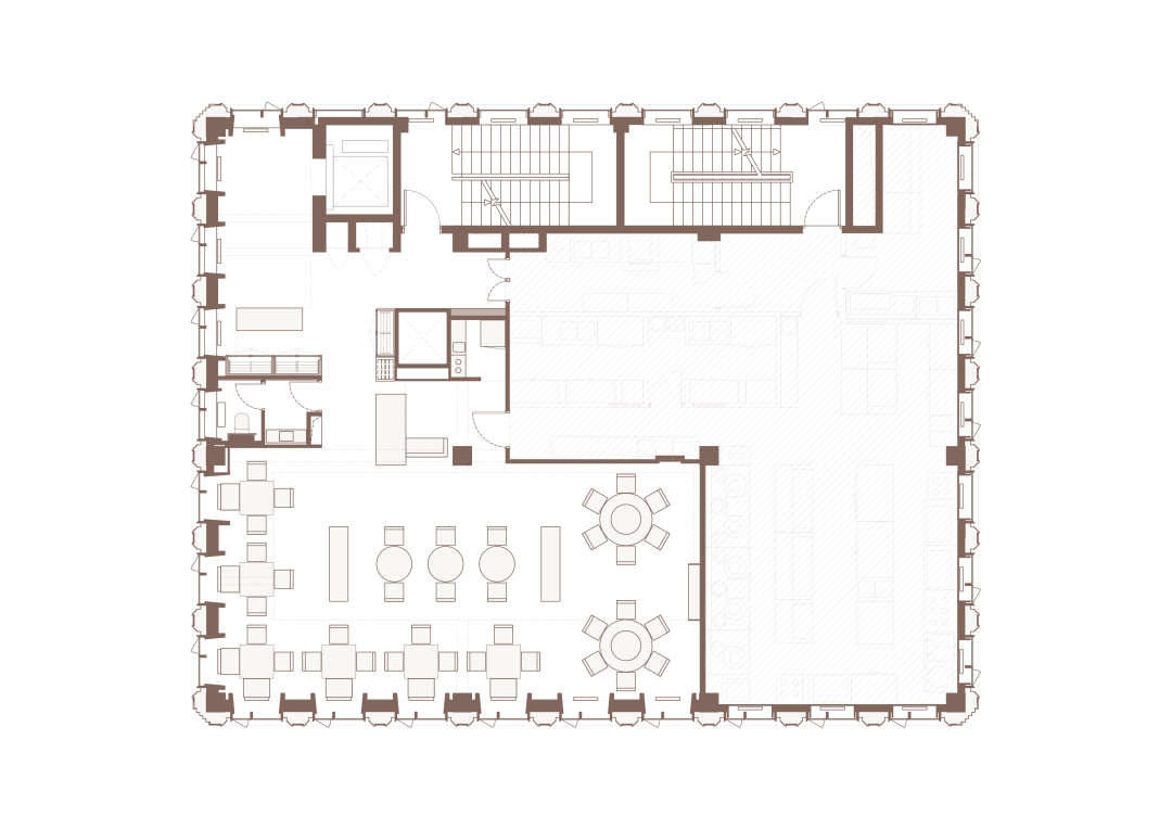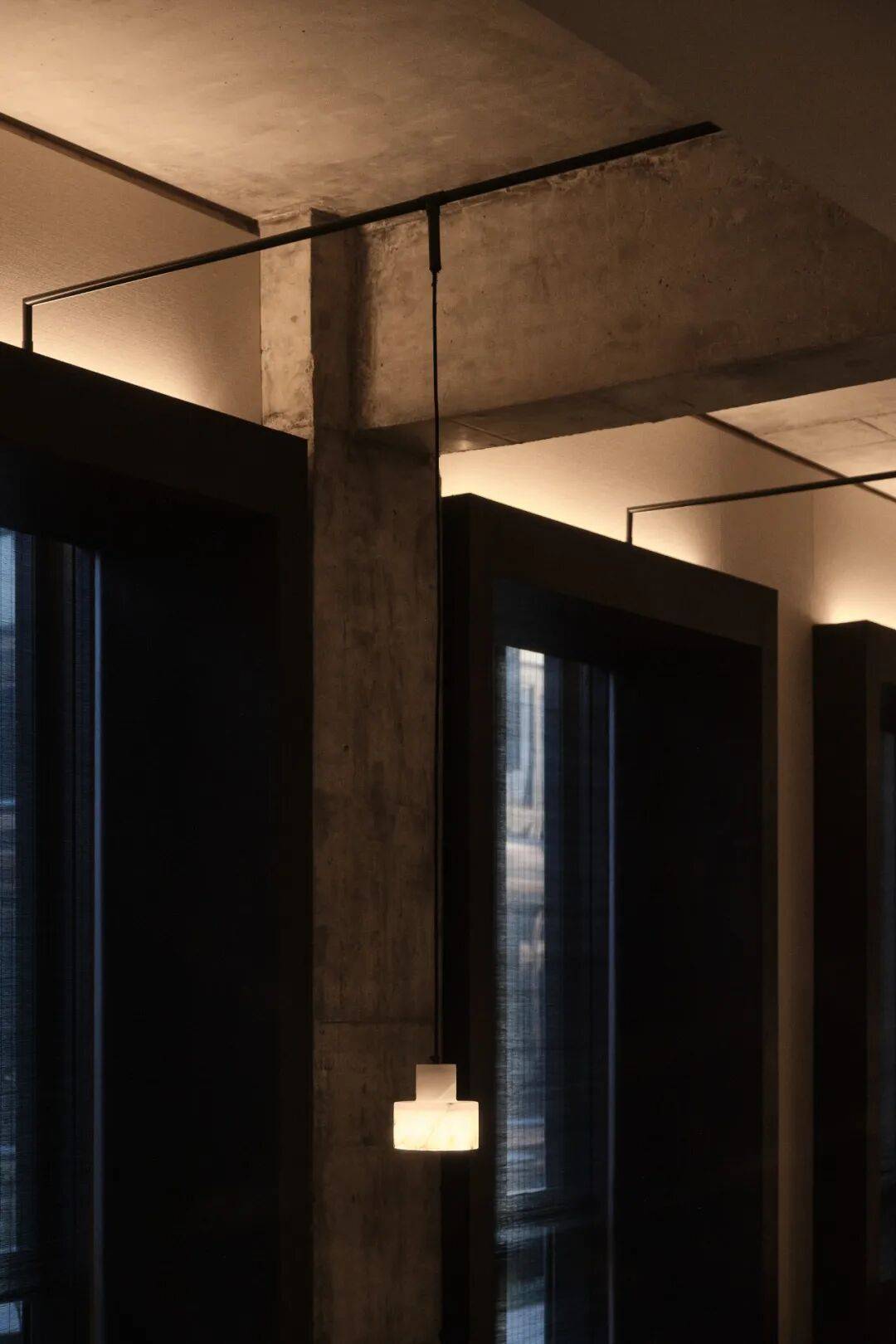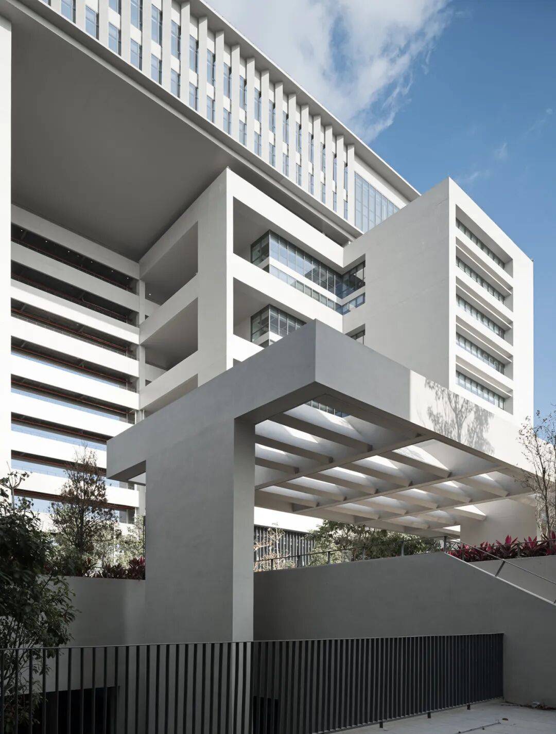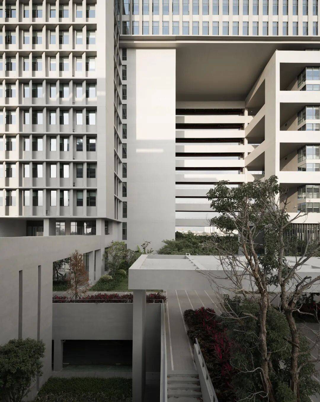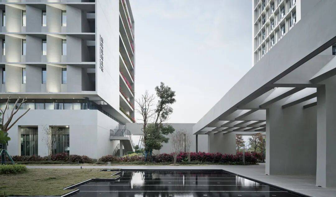 绝大部分的建筑立面是介于虚实之间的“灰”。作为建筑使用者长期停留的空间,如何平衡采光与室内热舒适性成为设计的重点。立面设计采用两套网格系统:内侧墙面根据各个房间尺寸均匀开窗,外侧水平线条与竖向遮阳板形成独立于房间以外的第二套网格系统,这样的设计使内部房间可以满足自由划分的同时,赋予建筑规整统一的外立面形象。