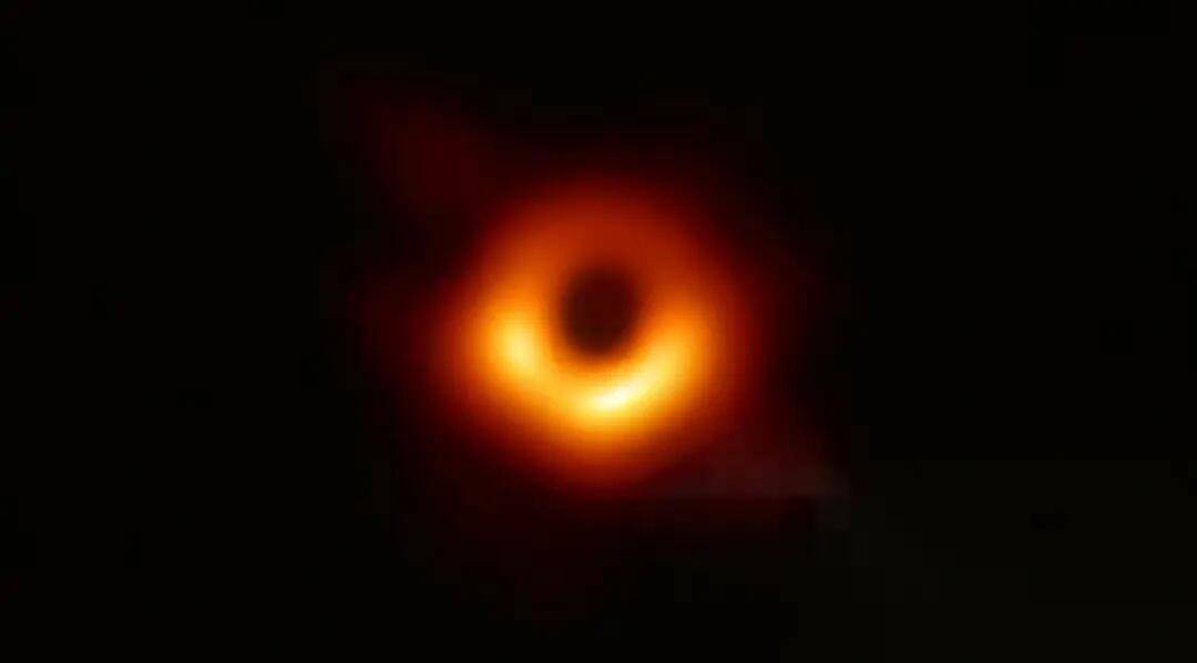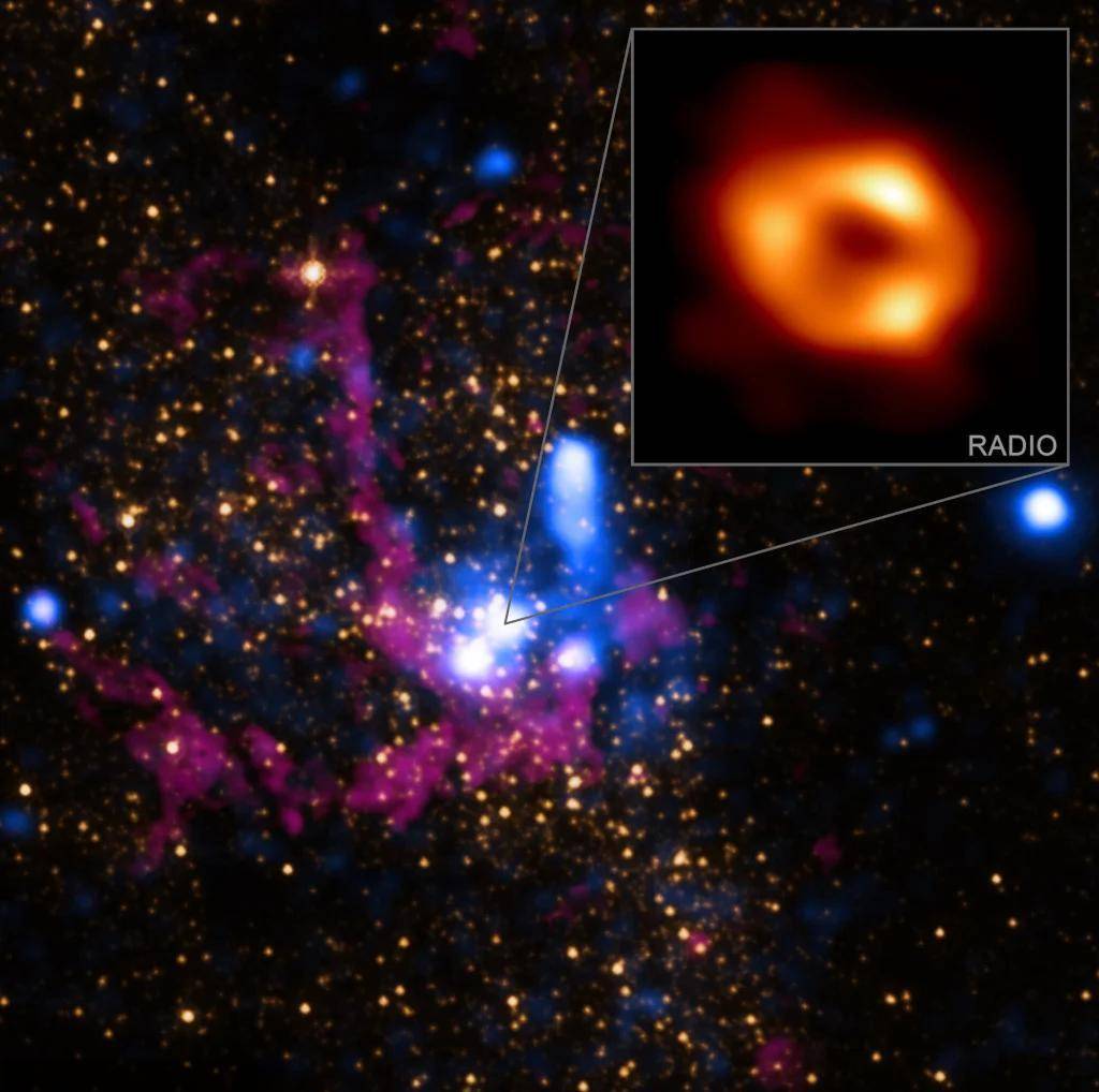 而我们的 Sgr A*,目前处于“宁静期”,它的吸积盘相对较小、较暗,并没有每时每刻都在吞吃恒星。它现在的食物主要是一些稀薄的恒星风和少量的气体云,所以现在的银河系中心亮度,主要还是靠那密密麻麻的恒星群撑场面,黑洞本身的吸积辐射只是配角。 2022 年 5 月,事件视界望远镜合作组发布了人马座 A* 的第一张照片,那张照片看起来像一个模糊的橙色甜甜圈,中间的黑色:就是黑洞的阴影,周围的橙色光环是发光的气体盘被引力透镜效应扭曲后的样子。