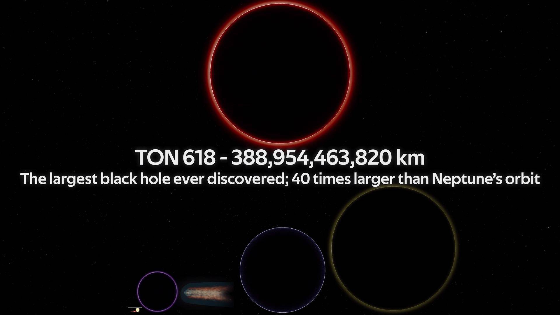 黑洞的边界叫做史瓦西半径,是连光都逃不出去的地方,TON 618 的史瓦西半径约为 1950 亿公里,直径则是 3900 亿公里,果把 TON 618 放在太阳系中心,它的视界将瞬间吞没所有的八大行星、柯伊伯带以及一部分奥尔特云,光即便是以每秒 30 万公里的极速,想要横穿这个黑洞的直径,也需要 15 天。