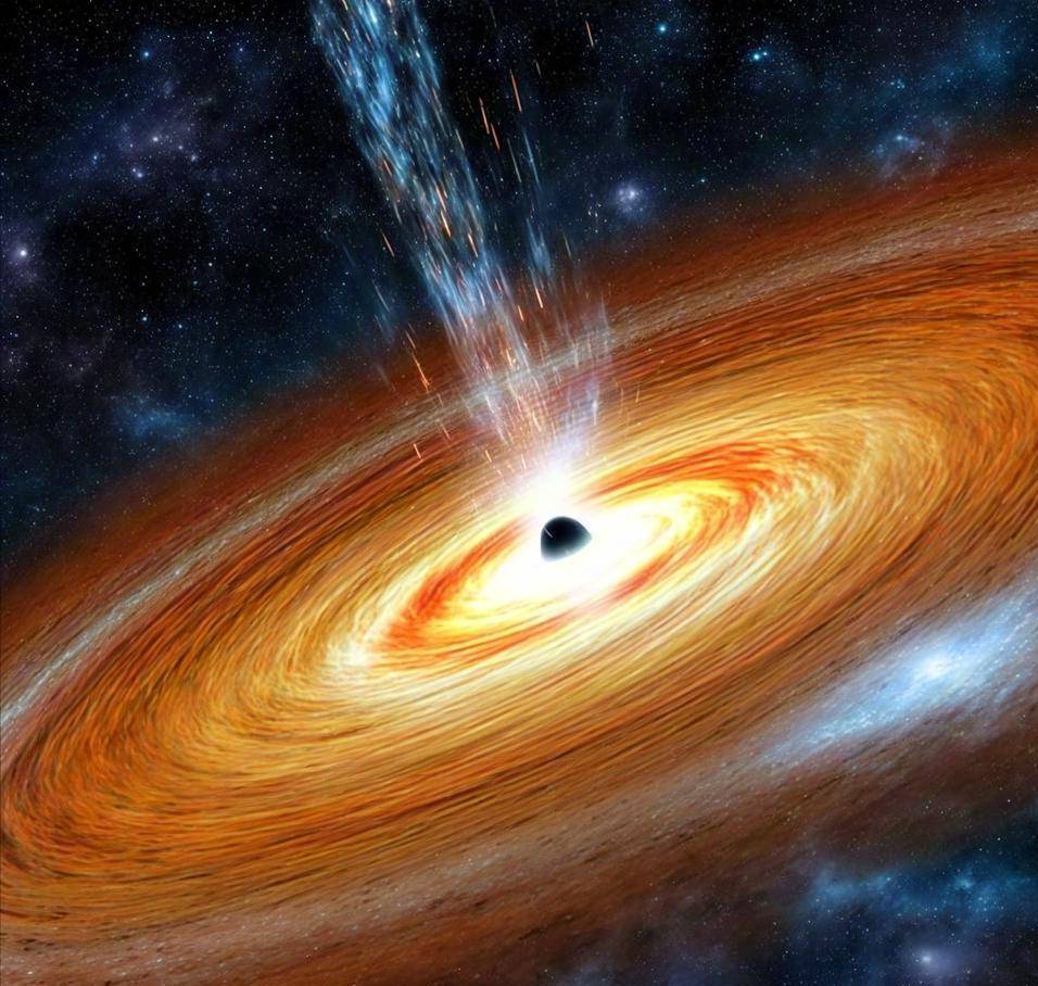 这个旋转的物质盘叫做吸积盘。 在 TON 618 的吸积盘中:物质以极高的速度互相摩擦,产生了高达数千万甚至数亿摄氏度的高温,这种温度足以让它疯狂地释放出 X 射线和伽马射线,一部分物质并不是掉进黑洞,而是被极强的磁场加速,沿着黑洞自转轴的两极,像激光枪一样向宇宙深处喷射出去,这道喷流可以长达数百万光年。
