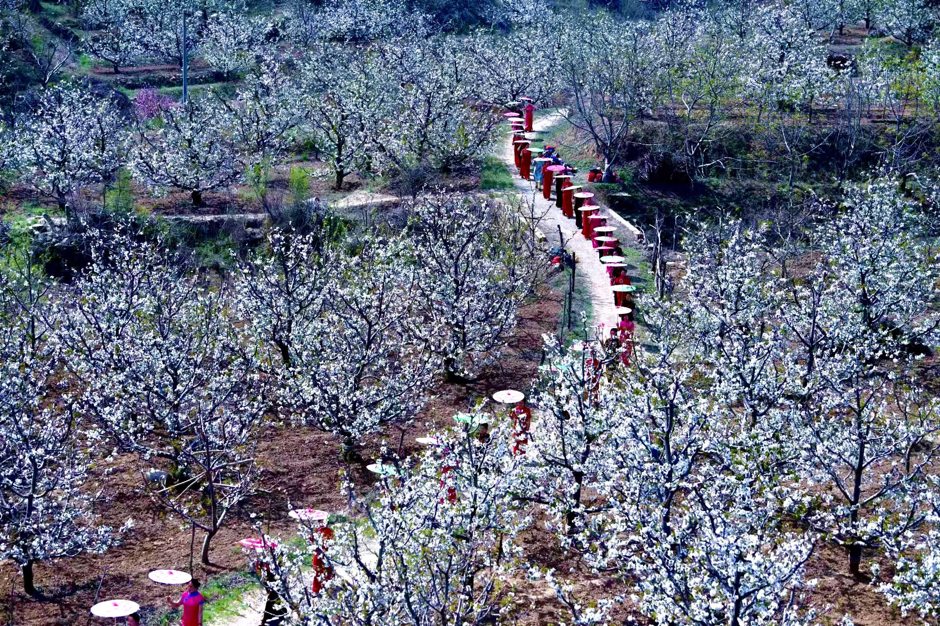 从高空俯瞰,万亩樱桃花次第铺展,像一场落在汶阳田上的雪,温柔又磅礴。风一吹,花瓣簌簌飘落,连空气里都飘着清甜的香气,每一帧都能直接当壁纸,这是独属于安驾庄镇的春日浪漫,刻在我们每一个人的回忆里。