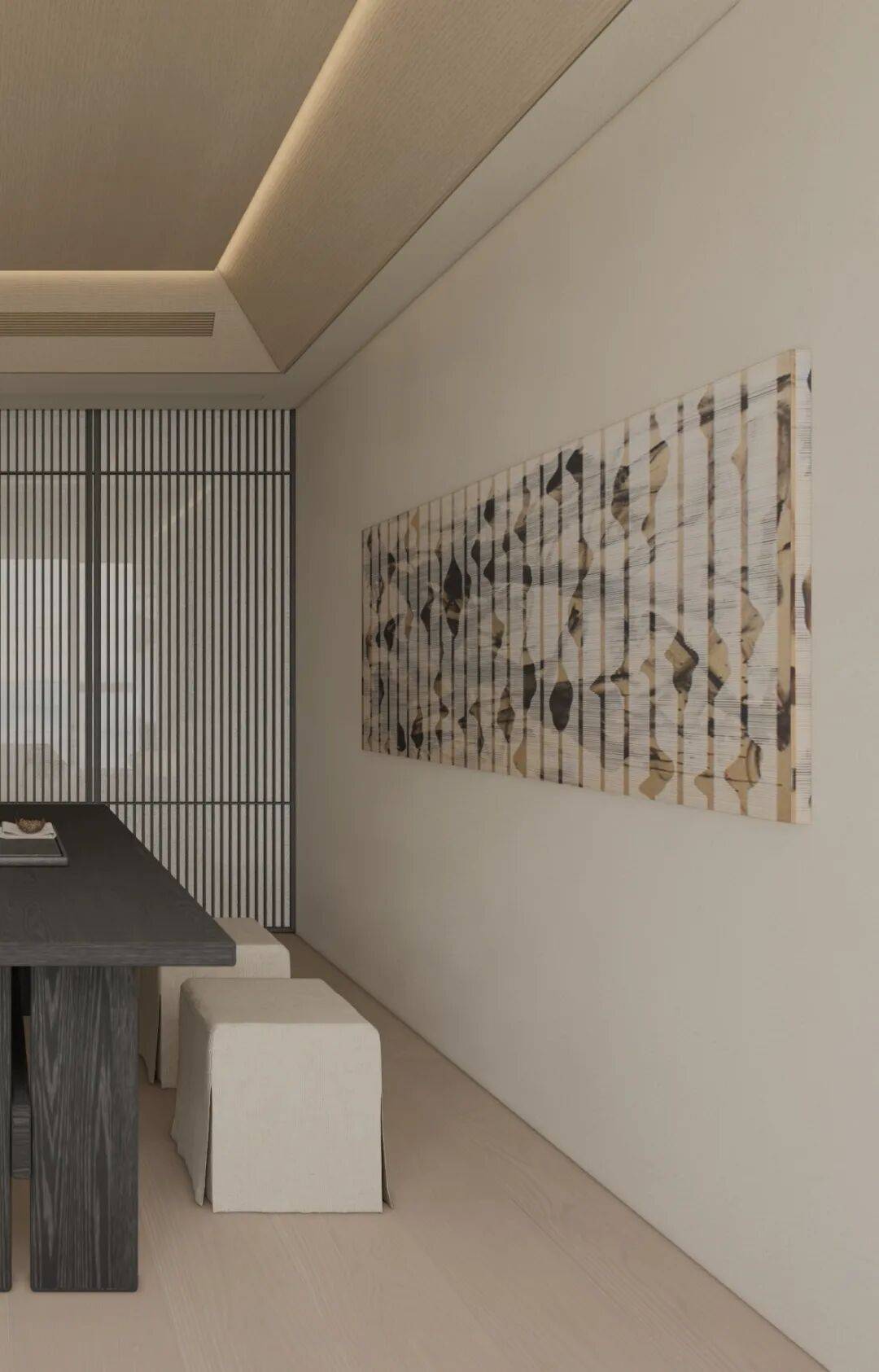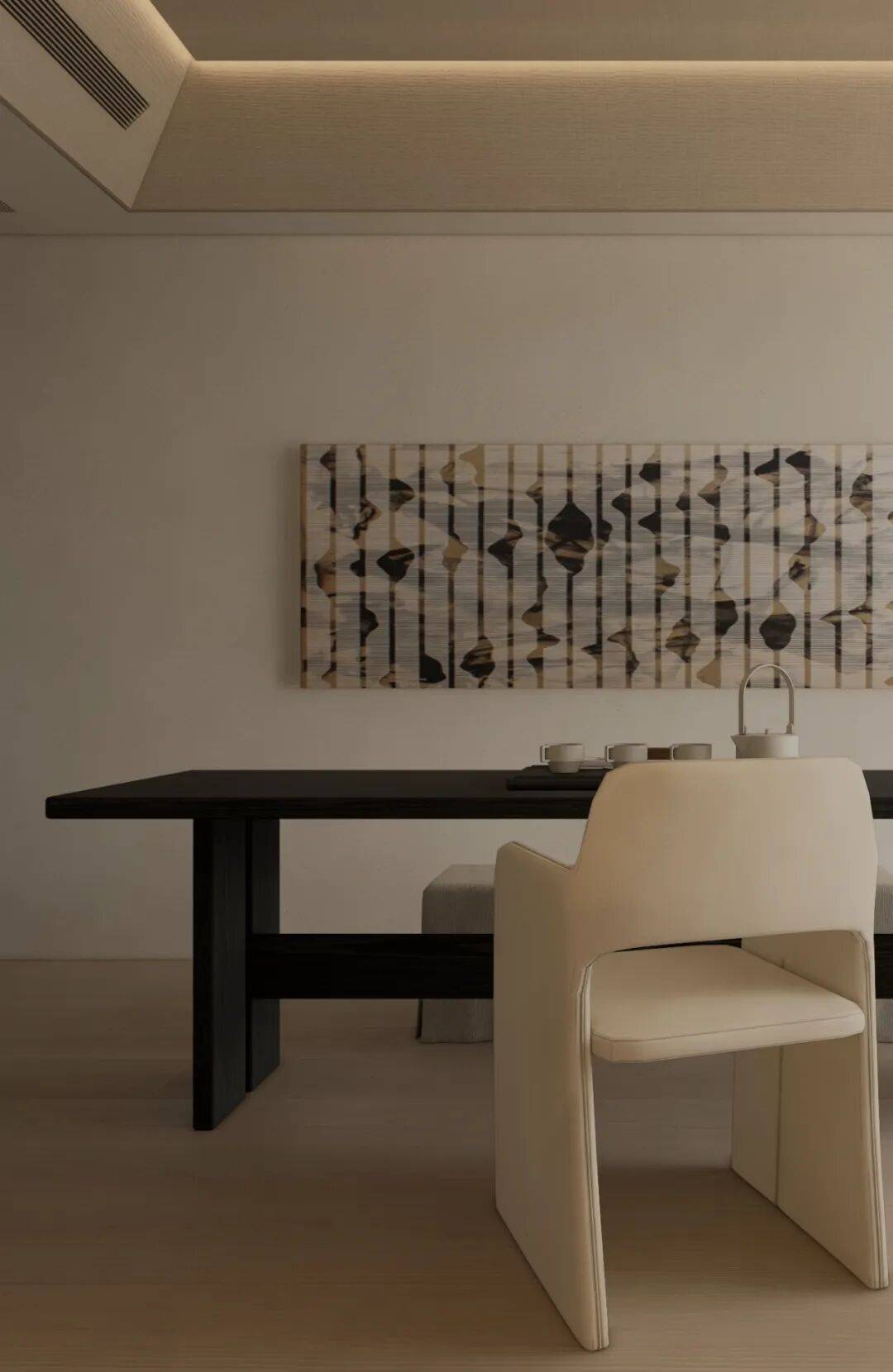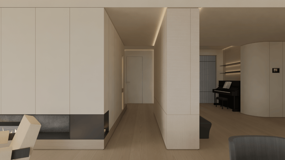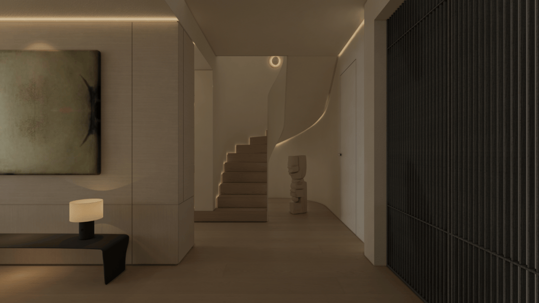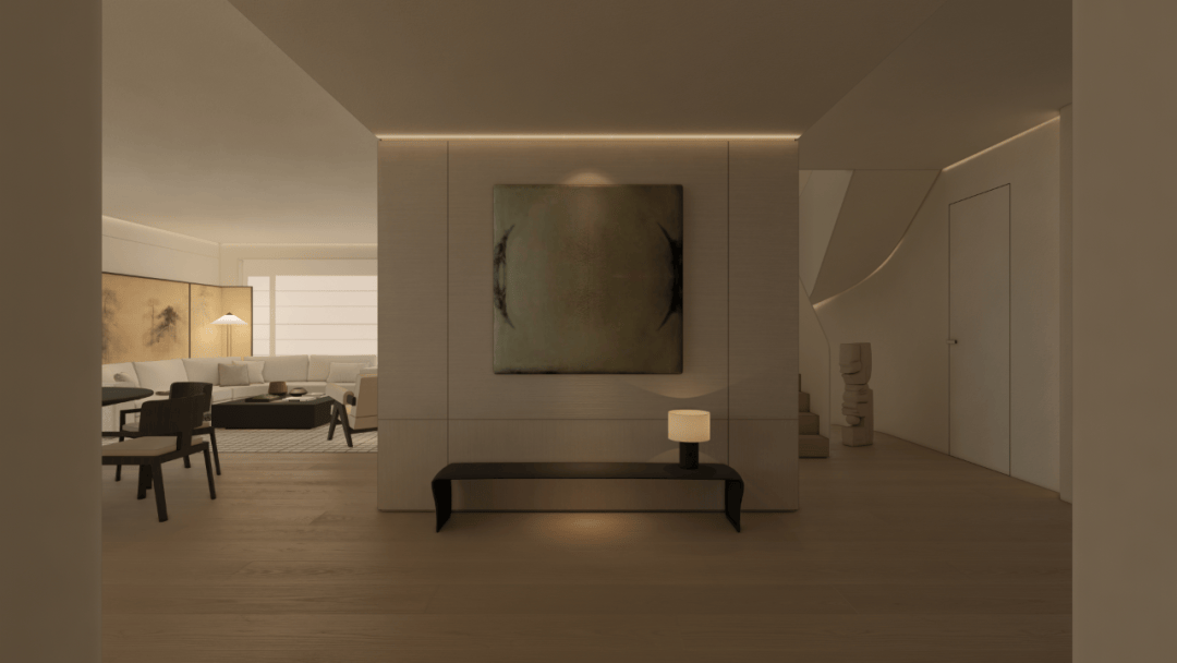 从素色的呼吸感,到光影的仪式感,再到艺术的精神意,这方玄关践行着「极简静奢」的核心:它不追求表面夺目,而是让空间成为 「精神的容器」。当指尖触到木的温润,目光落进画的朦胧,光影在墙面漾出涟漪时,真正的玄关,是「生活与美学的第一重共鸣」,是「心灵栖居的序章」。