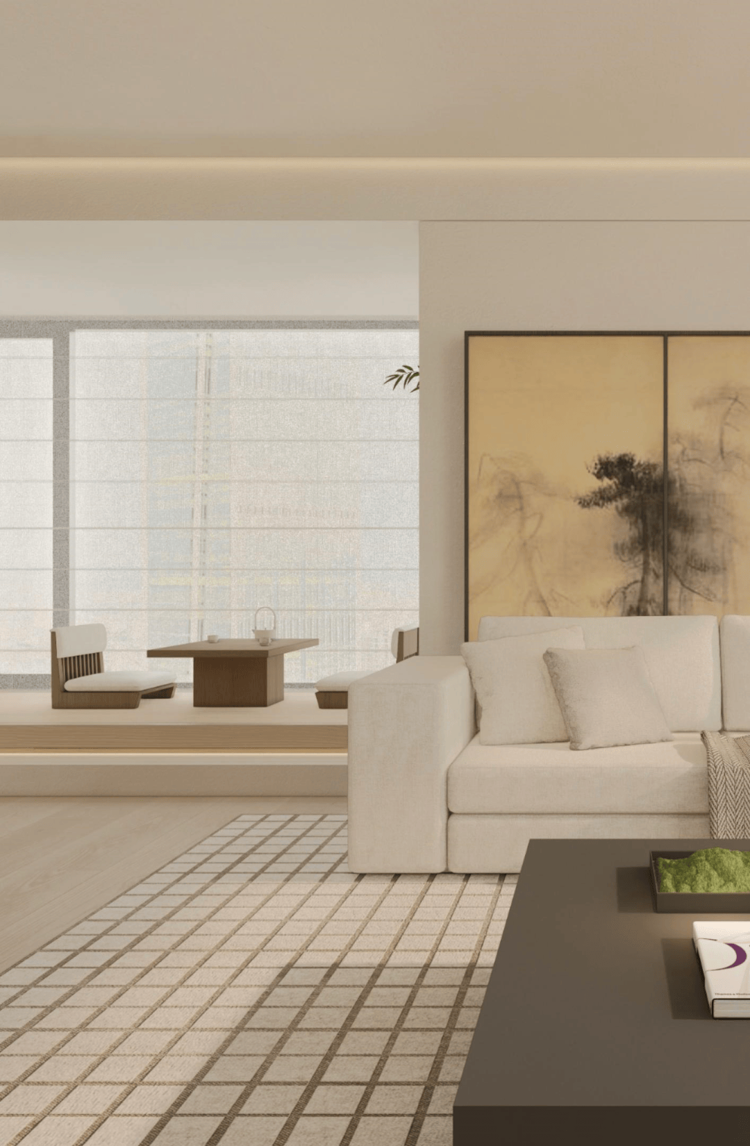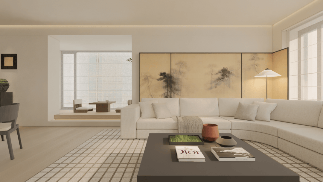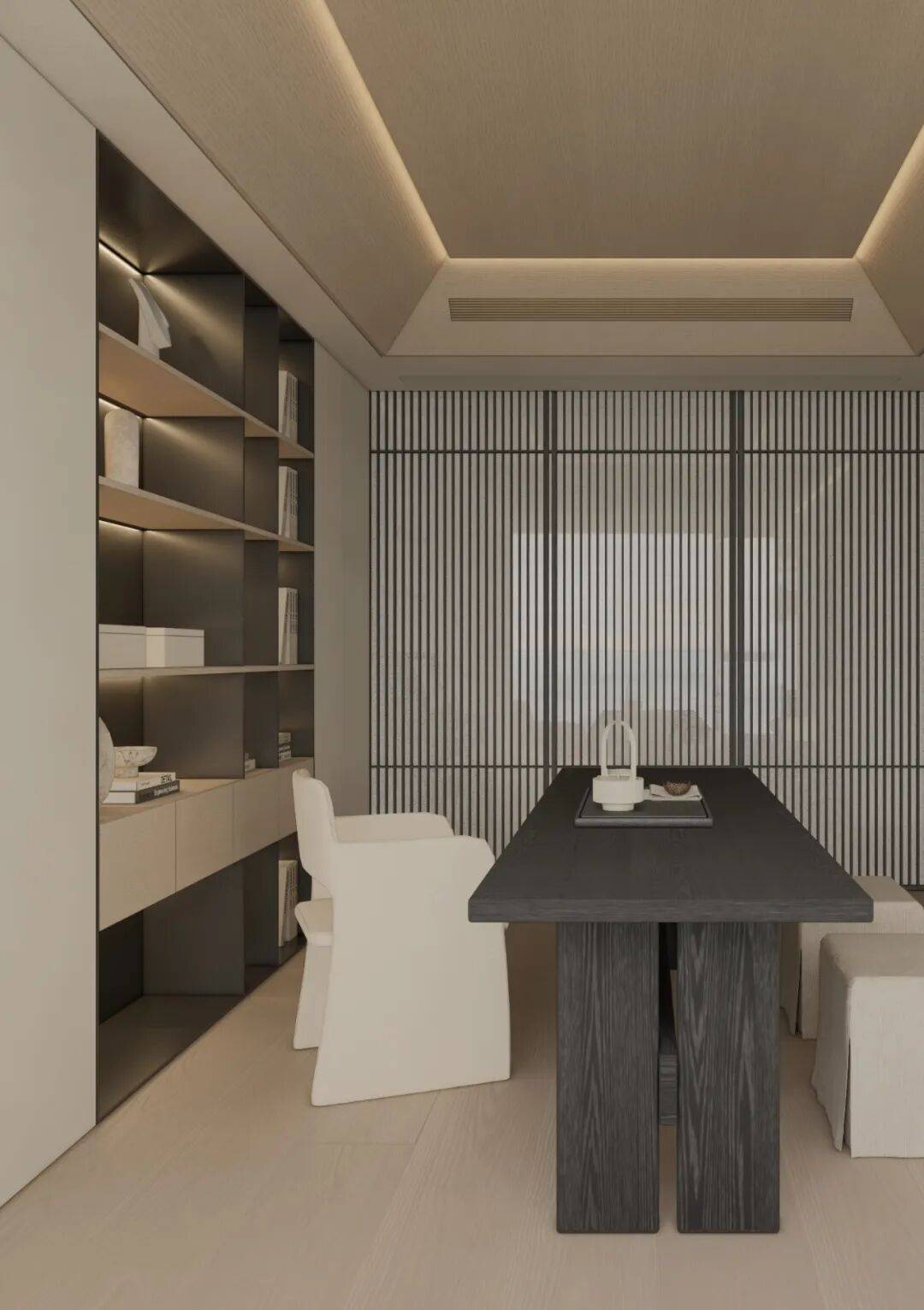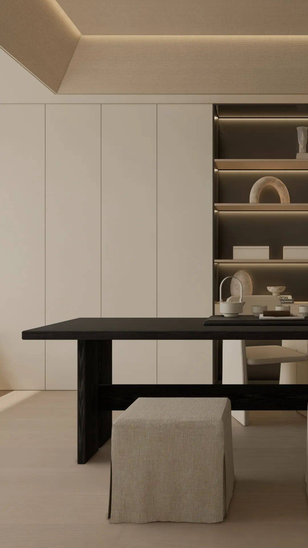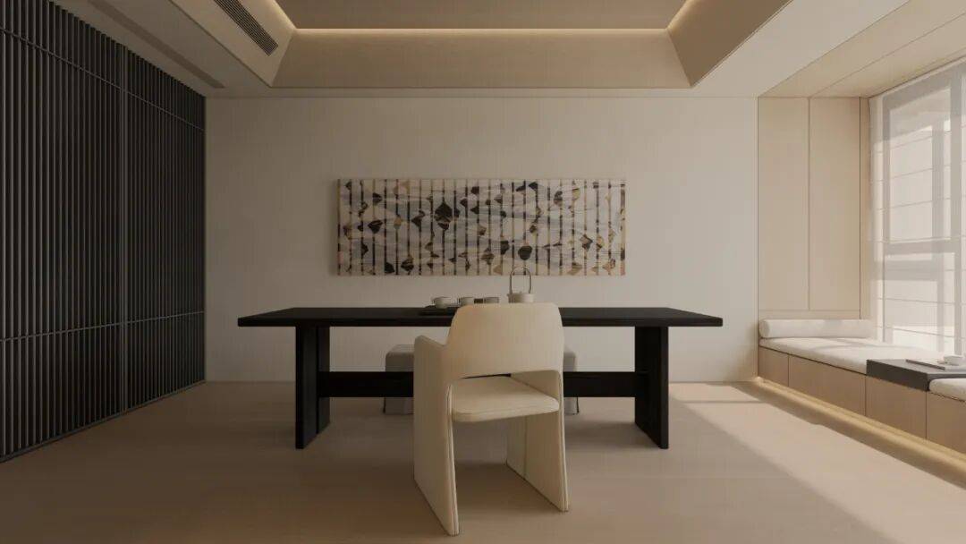 没有繁杂装饰,却用「克制的收纳美学」说话 —— 书与藏品各得其所,背景墙于是有了 “静奢的叙事感”,目光所及都是沉淀的质感;与人、茶、与自己好好相处。